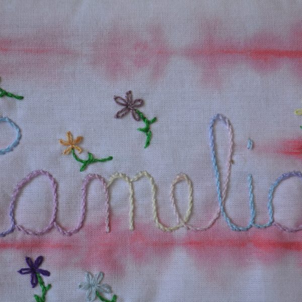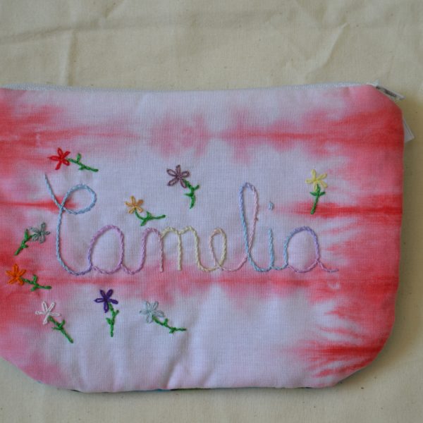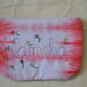 Organizator brodat manual cu numele Camelia, din bumbac dublat cu vatelina.