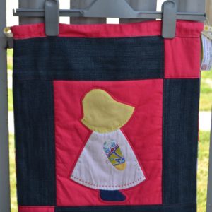 Sac pentru gradinita, potrivit pentru hainute. Cu aplicatie manuala, dublat, strangere cu banda textila. Unicat.